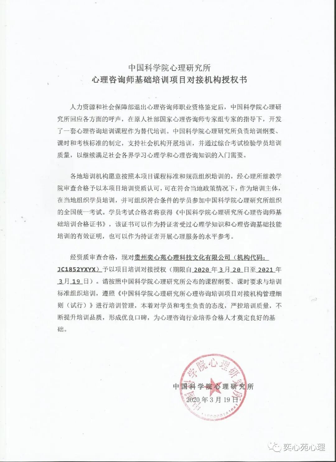 贵州奕心苑心理机构(机构代码: JC1852YXYX)获得中国科学院心理研究所同意,引进心理咨询基础培训项目(可登陆心理所继续教育学院网站首页“通知公告”栏,点击相关新闻查阅对接机构名单http://www.psych.ac.cn/jixujiaoyu/)。我们将秉承“普及心理学知识,培养心理服务人才”的宗旨,以学员为中心,以培训质量和服务质量为立身之本,为广大的心理学爱好者提供优质、专业的培训服务。